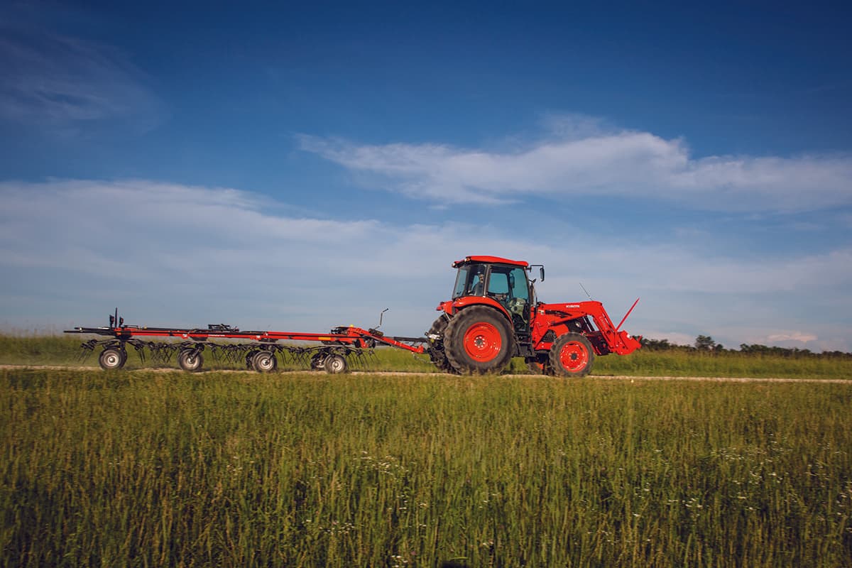 Kubota's TE6583T and TE8511T are both easily converted from working to transport position. Wheels are fixed during transport for smooth and stable running. This can all be done from the tractor seat, only requiring on 1 set of hydraulic outlets. Both models are approved for 25 mph.